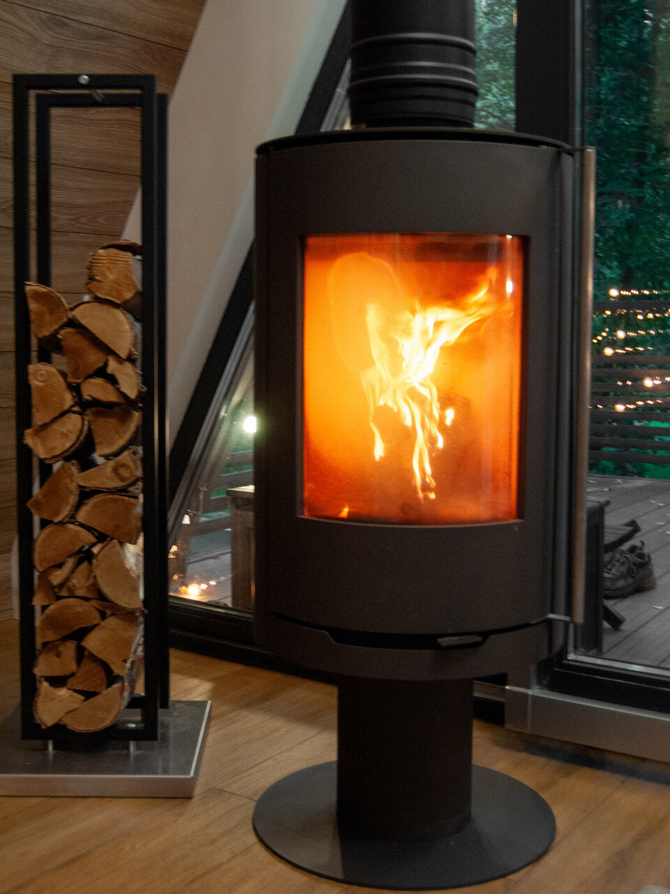За отопление отвечают системы теплого пола, конвекторы или печи-камины, поэтому внутри всегда тепло и уютно, даже в самые сильные морозы. А вид на заснеженный лес из панорамного окна — это то, за чем едут зимой!